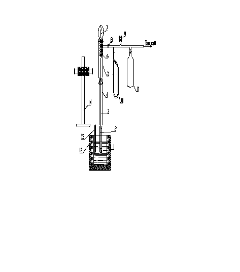 1 – кварцова чашечка; 2 – кварцовий гачок; 3 – кварцова нитка; 4 – нижня частина верхнього ковпачка; 5 – середня частина верхнього ковпачка; 6 – нижній кінець кварцової пружини; 7 – ковпачок; 8 – скляний кран до диференційного манометра; 9 – електронна лампа; 10 – диференційний манометр; 11 – балон; 12 – термостат; 13 – термометр; 14 – катетометр.