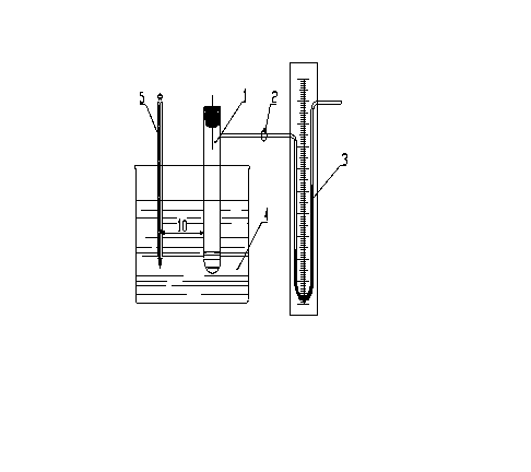 1 - пробірка; 2 – трьохходовий кран; 3 – ртутний манометр; 4 – баня; 5 – термометр