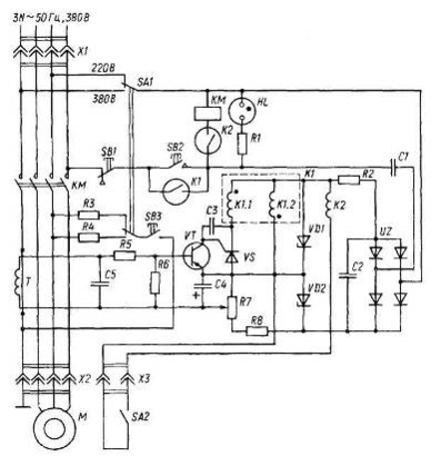 Для підвищення безпеки роботи з РЕМ класу І та запобігання ураженню електричним струмом у виробничих умовах останні приєднують до електричної мережі через захисно-вимикальні пристрої. Схему одного з цих пристроїв И39814 наведено на рис. 2. Датчиком струму витікання є трансформатор Т, первинна обмотка якого увімкнена послідовно в коло захисного нульового проводу. Пристрій підключається до електричної мережі і ручної машини че рез штепсельні з‘єднання XI і Х2. Вмикають пристій на тисканням на кнопку 8В2. При цьому через випрямляч VI подається напруга на об мотку іГІ.2 герконового реле Кі, замикаючий контакт якого шунтує кнопку 8В2. Для вмикання двигуна руч ної машини М натискують на вмонтований у рукоятку машини вимикач 8А2, через який подається напруга на обмотку герконового реле К2. Контакт реле К2 замикає коло котушки магнітного пускача КМ. Головні контакти останнього вмикають двигун М у мережу.
