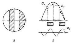 а — схема: б — поперечний переріз ротора, магнітна частина заштрихована; в — форма кривих магнітного потоку: Фі — первинної обмотки, Ф3 — у повітряно му зазорі, Ф4 — вторинної обмотки