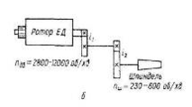 Особливістю електропривода одношвидкісного електросвердла з колекторним двигуном є кінематична схема (рис. 6, б), в якій вал електродвигуна є однією з шестерень редуктора.