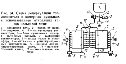 Вдоль стен камеры струи горячего воздуха, имеющие самую высокую температуру и самую низкую влажность, поднимаются вверх у стен и достигают подсводового пространства. Затем несколько охлажденный и насыщенный влагой горячий воздух захватывается нисходящим потоком. Таким образом, кирпич, находящийся ближе к стенкам камеры и под сводом, подвергаясь воздействию горячих газов с наименьшим насыщением влагой, высыхает значительно быстрее, чем кирпич, находящийся в среднем сечении камеры.