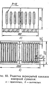 Плиты перекрытий приточных каналов делают в виде чугунных или стальных решеток со щелями, а вытяжные каналы перекрывают иногда деревянными решетками с одинаковым шагом отверстий (рис. 83).