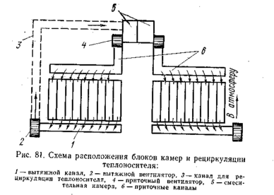 Теплоноситель движется от источников тепла до камеры, в самой камере и удаляется в атмосферу принудительно с помощью приточных 4 и вытяжных 2 вентиляторов (рис. 81).