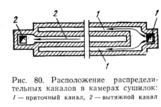 За пределами камеры оба приточных канала 1 (рис. 80) объединены в один, соединенный клапаном с центральным приточным каналом.