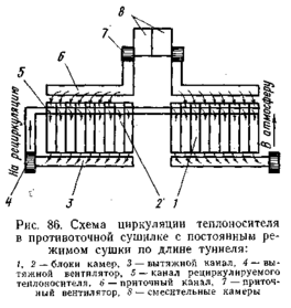 По схеме, показанной на рис. 86, туннельные камеры объединены в два блока 1 тл 2, каждый блок имеет вытяжной канал 3, вытяжной вентилятор 4, приточный канал 6, приточный вентилятор 7, смесительную камеру 8. При рециркуляции одни блоки камер объединены каналом 5, через который в них поступает отработанный теплоноситель.