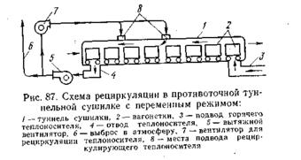 Схема рециркуляции может быть иная. На рис. 87 показана схема рециркуляции в противоточной сушилке с переменным режимом сушки по длине туннеля с разделением зон усадки и досушки.