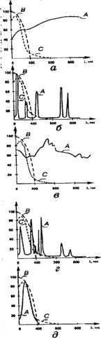 На рис. 1 показаны спектральные характеристики излучения разных источников света (кривая А) и характеристики спектральной чувствительности поглощения копировальных слоёв предварительно сенсибилизированных формных пластин (B — негативный, С — позитивный копировальные слои). Здесь рис. 1, а соответствует источнику света — дуговой лампе, рис. 1, б — ртутной лампе; рис. 1, в — ксеноновой лампе; рис. 1, г — металлогалогенной лампе, а рис. 1, д — люминесцентной лампе. По оси ординат отложена спектральная чувствительность (в процентах), по оси абсцисс — длина волны излучения (в нанометрах).