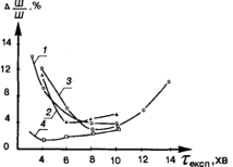 На продолжительность процесса экспонирования и качество печатной формы влияют также характер спектрального распределения интенсивности источника актиничного излучения и параметры падающего луча света, который падает (форма и направление), которые определяются конструкцией устройства отражения копировальной рамы. По данным, приведенными на рис. 2, меньше всего искажение графических элементов печатных форм (промежуточных и печатных) при минимальной экспозиции наблюдается в копировальных устройствах, оборудованных лампами ЛУФ-80 и ДРТИ-2000.
