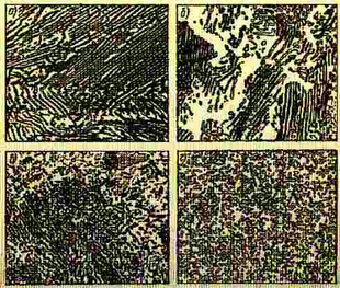 Рис. 1. Мікроструктура перліту (Х 1000): а - пластинчастий; б і, в - пластинчастий, такий, що частково перетворився на зернистий; г - зернистий.