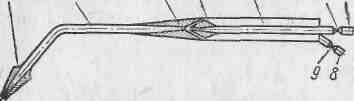 В цих пальниках (рис. 5) кисень під тиском 0,2—0,4 Мн / м- (2—4 ат) подається через ніпель 7 і регулюючий вентиль в інжектор 4. Інжектор має вузький центральний отвір — сопло і поздовжні прорізи по циліндричній поверхні. Виходячи з отвору сопла з великою швидкістю, кисень створює в камері змішування З сильне розрідження. Внаслідок цього розрідження ацетилен, що має більш низький тиск, засмоктується через ніпель 8, регулювальний вентиль для ацетилену 9, внутрішній канал рукоятки 5, поздовжні пази інжектора 4 в камеру змішування 3. Тут кисень і ацетилен утворюють горючу суміш, яка з камери змішування 3 трубкою 2 надходить в мундштук 1. При виході з мундштука і запалюванні цієї суміші утворюється зварювальне полум'я. Потрібне співвідношення газів у пальнику регулюється кисневим 6 і ацетиленовим 9 вентилями.