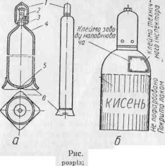 Кисневий балон (рис. 1) являє собою циліндричну посудину, виготовлену із сталевих суцільнотягнутих труб. У верхній його частині є горловина 4 з внутрішньою конічною різьбою, куди вкручується запірний латунний вентиль 2. На горловину насаджують кільце 3 для нагвинчування запобіжного ковпака 1.На випуклому днищі 5 насаджений башмак 6, що надає стійкості балону. Фарбують кисневі балони в-голубий або синій колір.