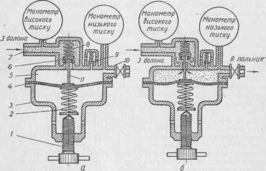 Кисневі редуктори (рис. 2) призначені для зниження високого тиску кисня, що знаходиться в балоні, до робочого 0,2—0,4 Мн/м2 (2—4 ат) при зварюванні і до 1,2—1,4 Мн/м2, (12—14 ат) при різанні і для підтримання його постійної величини незалежно від витрати кисню з балона і зниження в ньому тиску.