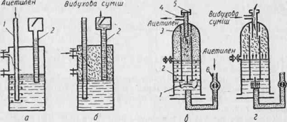 Генератори контактної системи «зануренням» (рис. 3, в) або витісненням (рис. 3, г) характеризуються тим, що в них карбід кальцію з водою, залежно від величини тиску, стикається періодично. В першому випадку (рис. 3 ,б) при збільшенні тиску вище граничного відбувається підйом газгольдера 2 і виймання карбіду кальцію з води. В другому випадку (рис. 3, г) при надмірному тиску ацетилену вода витискується в сполучену посудину, і розпад карбіду кальцію теж припиняється. При зниженні тиску відбуваються зворотні явища.