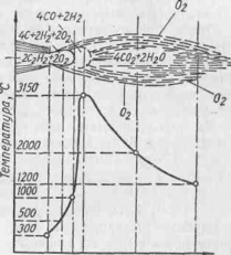 Рис. 6 Схема нормального ацетиленово-кисневого полум'я і розподіл температур по довжині полум'я