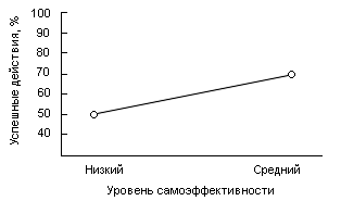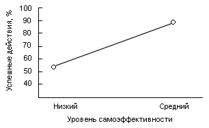 Как показано на рис.5, существует прямая связь между результатами достижений, когда испытуемые были на низком уровне эффективности и когда те же испытуемые были на среднем уровне. В этом эксперименте [Bandura et al.,1982] также было обнаружено почти полное соответствие между суждениями испытуемых о собственной эффективности и уровнем их достижений. Если испытуемая говорила, что она не может даже посмотреть на паука внутри пластиковой чашки, ей редко удавалось преодолеть свой страх. Наконец уровень возникновения страха (сопровождающий выполнение угрожающих действий), о котором сообщали испытуемые, соответствовал почти полностью уровню неэффективности. Если испытуемая была высокого мнения о своей эффективности в каждом отдельном задании, у нее почти не было опасений по поводу будущих результатов, и страх был меньше, когда она выполняла задание. Если, наконец, испытуемая была невысокого мнения о своей эффективности, она испытывала значительные опасения по поводу выполнения заданий, и во время их выполнения ее страх был велик.