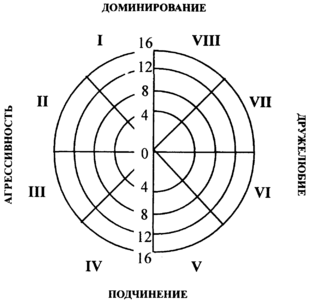 Для представления основных социальных ориентации Т. Лири разработал условную схему в виде круга, разделенного на секторы. В этом круге по горизонтальной и вертикальной осям обозначены четыре ориентации: доминирование-подчинение, дружелюбие-враждебность. В свою очередь эти секторы разделены на восемь – соответственно более частным отношениям. Для еще более тонкого описания круг делят на 16 секторов, но чаще используются октанты, определенным образом ориентированные относительно двух главных осей.
