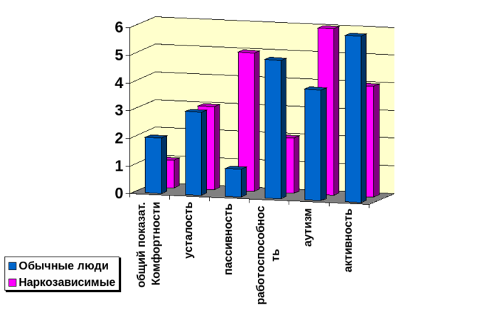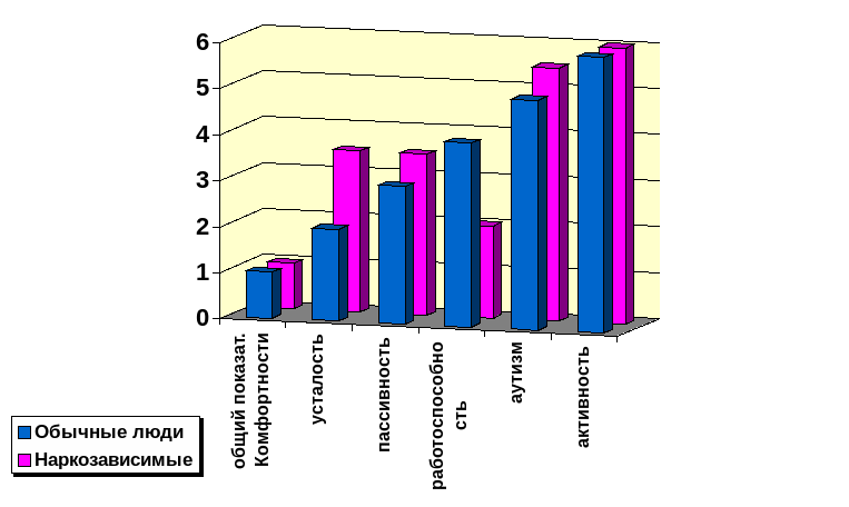 Не смотря на то, что статистически значимых различий по коэффициенту ранговой корреляции Спирмена не обнаружено, усреднённые данные, представленные в таблицах № 1-6, говорят о том, что имеются явные тенденции к изменению показателей жизнедеятельности, характеристик личности и функциональных механизмов между наркозависимыми и не употребляющими наркотические вещества людьми. Судя по всему, мы выбрали не совсем адекватный метод оценки статистически значимых различий. Коэффициент ранговой корреляции Спирмена вряд ли смог оказаться демонстративным при данной выборке испытуемых. Предварительная выборочная проверка данных по U критерию Мана - Уитни свидетельствует о том, что значимые различия существуют почти по всем показателям. К сожалению, недостаток времени не позволил нам осуществить статистический анализ в полной мере. Это будет нашей задачей на ближайшее будущее.