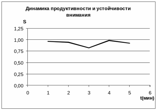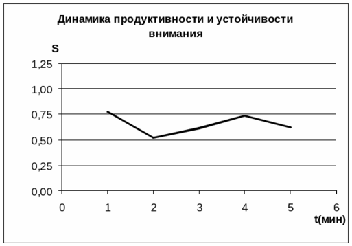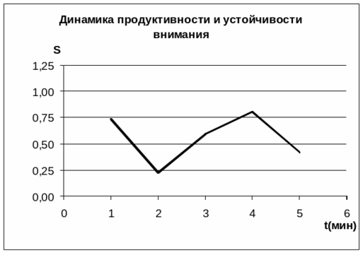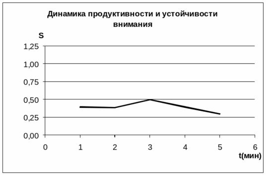 Вывод: На графике мы видим, что показатель S находится в границах от 0,24 до 0,50 балла, а все точки графика не выходят за пределы одной зоны, таким образом делается вывод, что продуктивность внимания низкая, но устойчивость внимания высока. Продуктивность испытуемого оценивается на 2-3 балла, а устойчивость внимания на 10 баллов.