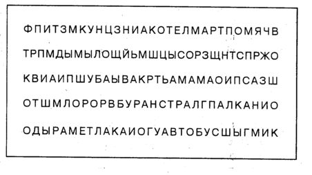 На бланке напечатаны буквы в случайном порядке (5 строчек). В каждой строке примерно 30 букв. Ребенок просматривает внимательно каждую строку и пытается обнаружить среди случайных букв слова. Он должен отыскать эти слова (трех-, четырех-, пятибуквенные) и подчеркнуть их.