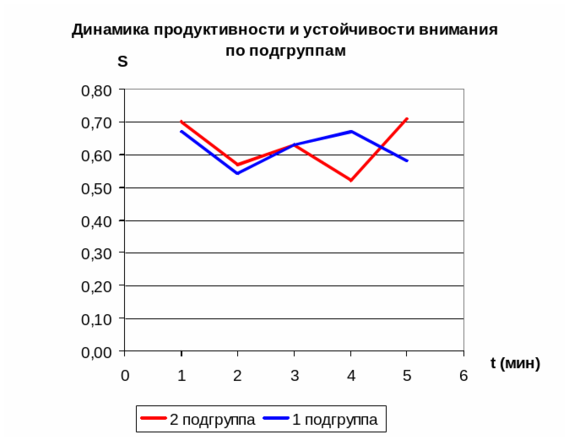 Таким образом, оба графика находятся в зоне среднепродуктивного внимания, но у второй подгруппы колебания внимания существеннее чем у первой , т.е в первой подгруппе внимание более устойчиво. Мы видим, что дифференциация внимания произошла, следовательно, методика была выбрана верно и соответственно возрасту. Не у всех испытуемых еще сформировано внимание для поступления в школу. Педагогу группы и родителям были даны рекомендации по развитию устойчивости и продуктивности внимания. Эти упражнения взяты из книги «Течты для детей, сборник тестов и развивающих упражнений».Составители М.Н. Ильина, Л.Г.Парамонова, Н.Я.Головнева – СПб.: «Дельта», 384.