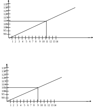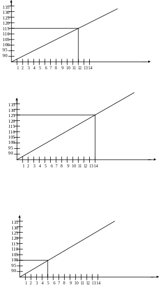 Оценка результатов исследования производится при помощи графиков. Они представляют собой усредненные нормативные показатели по данным этих двух субтестов. Норме в строгом смысле этого слова на каждом графике соответствует показатель равный 100% по вертикальной оси. Найдя пользуясь графиком, соответствующую точку на нижней оси (количество задач, правильно решённых испытуемым за 30 минут), восстановив из неё перпендикуляр до перечисления на вертикальную ось, можно определить коифициент интеллектуального развития испытуемого по данному виду мышления. Так, например, если за отведенные 30 минут испытуемый решил 16 задач, то показатель уровня развития его лингвистического мышления будет равна 130%. Если за такое же время число задач решённых по математическому субтесту то показатель условия развития математического мышления окажется равным 115%. Норме для лингвистического субтеста соответствуют 4-е правильно решённых задач а в норме для математического субтеста – 11 правильно решённых задач.
