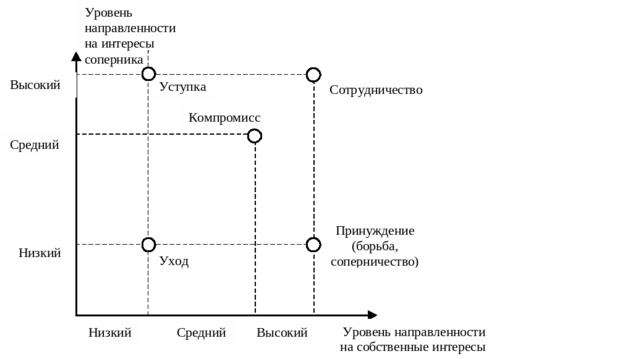 При анализе конфликтов на основе рассматриваемой модели нужно иметь в виду, что уровень направленности на собственные интересы или интересы соперника зависит от трех обстоятельств: