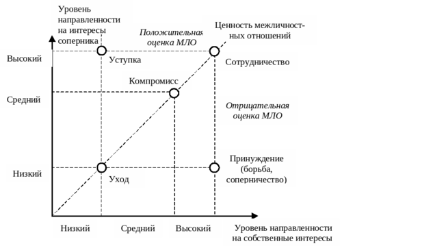 Особое место в оценке моделей и стратегий поведения личности в конфликте занимает ценность для нее межличностных отношений с противоборствующей стороной. Если для одного из соперников межличностные отношения с другим (дружба, любовь, товарищество, партнерство и т. д.) не представляют никакой ценности, то и поведение его в конфликте будет отличаться деструктивным содержанием или крайними позициями в стратегии (принуждение, борьба, соперничество). И, наоборот, ценность межличностных отношений для субъекта конфликтного взаимодействия, как правило, является существенной причиной конструктивного поведения в конфликте или направленностью такого поведения на компромисс, сотрудничество, уход или уступку. С.М. Емельянов дополняет двухмерную модель Томаса—Килменна третьим измерением — ценностью межличностных отношений (МЛО)50. Схематически она представлена на рис. 2