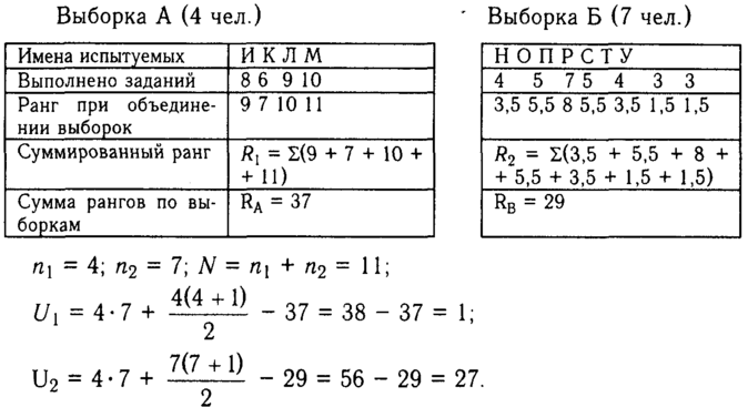 Имея величины U1 и U2, следует обратиться к таблице уровня значимости. На совмещение строки четвертой со столбцом седьмым находим 3/25. По условиям таблицы, U1 должно быть меньше верхней, a U2 — больше нижней величины. Полученные величины показывают, что ho отвергается. Можно утверждать, что между выборками имеется существенное различие: результаты свидетельствуют о преимуществе выборки A.