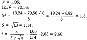 При вычислении t при попарном сравнении число степеней свободы равно п -1. По таблице уровней значимости для t находим, что для 7 степеней свободы t0,95 должно быть не менее 2,36. Поскольку получена большая величина, следует признать, что налицо статистически значимое влияние занятий физкультурой на самочувствие школьников.