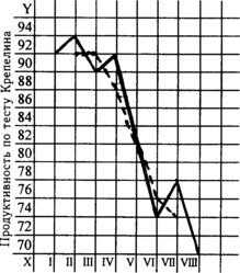 редположим, что психологу дано задание собрать информацию о состоянии умственной работоспособности школьников 8-х классов, начиная со второй недели учебного года и до девятой недели включительно. Одной из методик, с помощью которых можно фиксировать состояние умственной работоспособности, считается тест Крепелина. Он состоит из большого количества примеров, в каждом из них нужно складывать два двузначных числа; учитывается общее число правильно решенных примеров. Каждые 3 минуты испытуемые по сигналу экспериментатора отмечают черточкой сделанное. Общая длительность эксперимента в зависимости от возраста составит 9, 12 или 15 минут. Этой методикой и воспользовался психолог. Он начал с того, что сформировал из учащихся, средние успехи которых оценивались за предыдущее полугодие баллами 4 и 5, выборку из 10 человек. Все они изъявили желание участвовать в эксперименте. С этими учащимися психолог в течение первой недели учебного года провел по 12 тренировочных занятий; это было необходимо, иначе рост продуктивности вследствие упражняемости замаскировал бы изменения в динамике работоспособности. Затем начался эксперимент: по субботам после уроков учащиеся этой выборки в течение 12 минут работали с тестом Крепелина. Эксперимент, как было сказано, продолжался 8 недель. Были получены следующие данные, средние по всей выборке (рис. 4).Визуальная оценка полученного динамического ряда свидетельствует о снижении умственной работоспособности, в чем, конечно, нет ничего удивительного. Однако снижение идет не вполне равномерно. Это ясно видно из графика.
