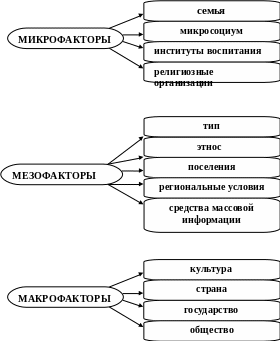 Социализация осуществляется под воздействием многих факторов, которые можно условно разделить на три группы (таблица №1): [68, с. 25]