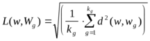 В алгоритмах распознавания, использующих детерминированные признаки в качестве меры близости, используется среднеквадратическое расстояние между данным объектом w и совокупностью объектов (w1,w2,....,wn), представляющих (описывающих) каждый класс. Так для сравнения с классом Wg это выглядит так