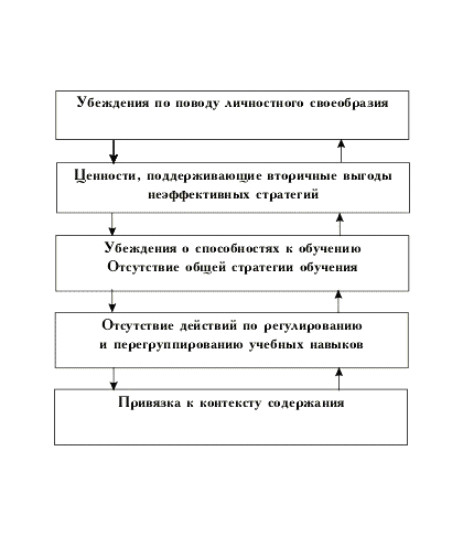 Эта группа убеждений характеризуется отсутствием навыка гибкого и быстрого перехода от содержания контекста к внутреннему содержанию способностей. Может показаться странным наличие таких инфантильных убеждений, как "Если я буду читать быстро, то я должен быстро читать любой текст, от детектива до учебника по физике". Или: "Я быстрее прочту текст, написанный большими буквами, чем маленькими", "Я люблю литературу, но вот русский язык ненавижу ": Однако, в своей работе мне приходится иметь дело с целой системой самопродкрепляющихся якорей, заложенной еще в детстве, и продолжающей функционировать автоматически. Жесткая привязка способностей к динамическому обучению к контексту содержания препятствует осознанию своих когнитивных стратегий и сужает возможности их моделирования.