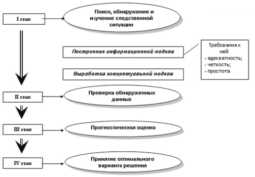 Следственная ситуация как разновидность проблемной ситуации характеризует взаимодействие следователя и его окружения, а также психическое состояние, присущее личности следователя, включенной в объективную и противоречивую по своему содержанию среду. Осознание какого - либо противоречия в процессе следственной деятельности (например, невозможность установления лица, совершившего преступление, трудности в проведении отдельных следственных действий и т.п.) приводят к появлению потребности в новых знаниях, в том неизвестном, которое бы позволило разрешить возникшее противоречие. Несколько упрощая можно сказать, что следственная ситуация, являясь проблемной по своей сущности, - это ситуация, требующая вмешательства следователя, принятия им решения, призванного воздействовать на условия расследования уголовного преступления. Такая ситуация всегда находиться у истоков принятия решения на проведение следственных действий. И здесь большое значение приобретает психологический анализ следственных ситуаций, который осуществляется через ряд определенных взаимосвязанных стадий.