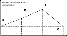 2 стадия начинается в точке B и доходит до наивысшего напряжения (точка C). Человека поглощает деструктивный стресс, происходит полная или частичная потеря сознательного самоконтроля, сопровождаемая аффективным состоянием.