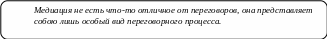 Участие медиатора заключается в организации переговоров, в придании им более конструктивного характера. Поскольку при медиации решение принимают сами конфликтующие стороны и сами они добровольно берут на себя обязанность его выполнять, постольку медиация по сравнению с судом и арбитражем дает больше уверенности в том, что конфликт будет успешно урегулирован. Статистика утверждает, что добровольные соглашения между конфликтующими сторонами выполняются лучше, чем судебные и арбитражные постановления. Даже в США, решения судов по гражданским делам выполняются не более, чем в 40% случаев, тогда как соглашения, полученные в результате совместной договоренности, соблюдаются обеими сторонами в 70% случаев.