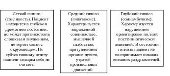 | Легкий транс | 6 7 10 11 | Офтальмоплегия Каталепсия конечностей Ригидная каталепсия Анестезия по типу «перчаток» |