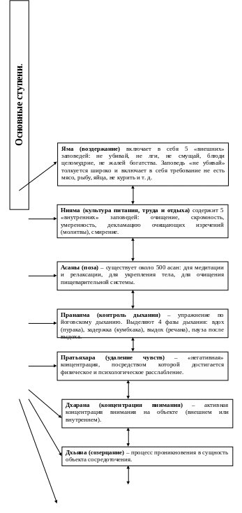 Последние 3 ступени (драхма, дхьяна и самадхи) являются этапами медитации. Переход от одного этапа к последующему не нуждается в применении специальной техники. Он связан только с увеличением глубины концентрации на объекте.