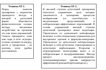 сновной заслугой Шульца является, прежде всего, то, что он освободил учение йоги от распространенной интерпретации или от налета мистицизма. Предложенная методика аутогенной тренировки в отличие от ее многочисленных модификаций называется классической и делится на 2 ступени; 1-я, или начальная (АТ-1), и 2-я, или высшая (АТ-2).