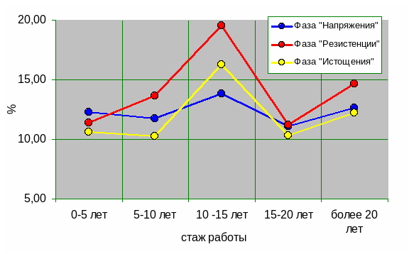 Анализируя показатели фаз на графиках, можно заметить, что в фазе “напряжения” наиболее высокие показатели, имеют педагоги со стажем работы: от 0 до 5 лет; от 10 до 15 лет и более 20 лет. В группах от 5 до 10 лет и от 15 до 20 показатели имеют более низкий уровень. В фазе “резистенции”, на графике мы видим постепенное возрастание уровня сопротивления от первой к третьей группе (от 0 до 15 лет), затем спад в группе педагогов со стажем работы от 15 до 20 лет и у педагогов со стажем работы более 20 лет этот уровень снова повышается. Фаза “истощения” наиболее ярко выражена у педагогов со стажем работы от 10 до 15 лет; затем у педагогов со стажем работы свыше 20 лет. И менее выражена у педагогов со стажем работы от 5 до 10 лет и от 15 до 20.