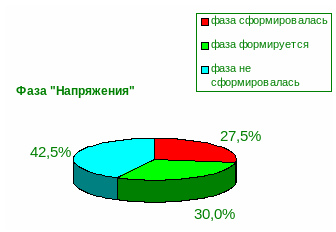 Наименее выраженным в данной фазе оказался симптом “эмоционально-нравственной ориентации”. Он сложился у 17,5% педагогов, причем это оказались педагоги только из первой группы. Складывается этот симптом у 22,5% педагогов, из них: 5% относятся к первой группе, 7,5% - ко второй и 5% к третьей группе. Для таких педагогов настроения и субъективные предпочтения влияют на выполнение профессиональных обязанностей. Педагог пытается решать проблемы подопечных по собственному выбору, определяет достойных и недостойных, “хороших” и “плохих”. В целом фаза” резистенции” сформировалась у 35% педагогов, находится в стадии формирования у 37,5%, и не сформировалась у 27,5%.