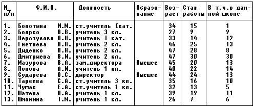 Объектом моих исследований является педагогический коллектив и администрация общеобразовательной школы I-III ступени N_4, которая была открыта в 1990 г. Школа располагается в установленном микрорайоне г.Макеевки. Педагогический коллектив школы составляет 120 человек, из них 20 мужчин и 100 женщин; 1 человек пенсионного возраста; 40% молодежи (стаж до 5 лет), основная же часть - люди среднего возраста (педагогический стаж от 5 до 20 лет). В коллективе работают достаточно квалифицированные педагоги, психологи, учителя. Технический персонал составляет 25 человек.