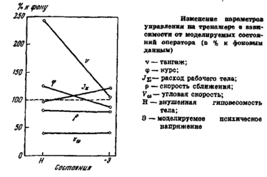 При эмоциональном напряжении почти все параметры управляющей деятельности выдерживались точнее, чем в фоновых экспериментах. Вместе с тем улучшение качества работы операторов в этом состоянии сопровождалось повышением суммарного расхода рабочего тела на 20% относительно контрольных цифр. Понятно, что возросшая осторожность и точность выдерживания заданных параметров полета приводили к дополнительной нагрузке на органы управления в виде возросшей частоты включения двигательных установок.