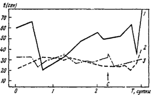 Несколько иной характер данных по аналогичной методике получен в трехсуточных вахтах непрерывной деятельности. У контрольного оператора, не подвергавшегося стимуляции, качество слежения к концу трехсуточной вахты ухудшилось по первой программе на 77%, по второй — на 55% относительно фоновых данных. У испытуемых, подвергавшихся гипностимуляции, отмечено ухудшение качества слежения в середине трехсуточной вахты. Гипностимуляции работоспособности вызвала резкое улучшение качества слежения у первого испытуемого и значительно меньшее— у второго.