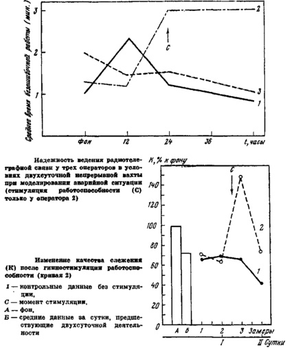 Изменение уровня работоспособности оператора в режиме непрерывной трехсуточной деятельности достаточно четко проявляется и на его функционировании в системе связи. Как показали эксперименты, время обработки радиограмм нарастает по мере утомления оператора. Эта закономерность ярко проявилась в трехсуточном эксперименте у первого оператора, работавшего без стимуляции. Если к тому же учесть, что с развитием утомления нарастало число ошибок при обработке радиограмм, то при тех же условиях надежность функционирования оператора в системе связи упала с С = 1,0 в начале эксперимента до С — 0,92 в конце его. У второго и третьего операторов такой картины не наблюдалось. Изменения надежности функционирования в системе связи находились у них в пределах С —1,0 в начале первых суток непрерывной деятельности иР = 0,95 — 0,935 в конце вторых суток. После стимуляции второго и третьего oператоров надежность функционирования их в системе связи возросла до С = 0,977 и снизилась к исходу третьих суток до 0,935.