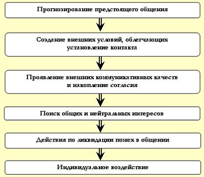 В установлении психологического контакта можно выделить несколько этапов, которые включают в себя часть общего процесса развития общения: