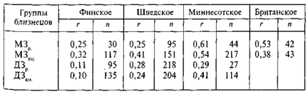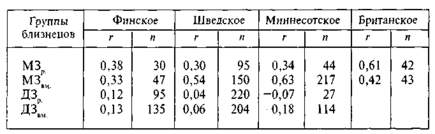 В табл. 10.2 и 10.3 приведены результаты четырех исследований разлученных близнецов: финского, шведского, британского, Миннесотского (США). В трех первых большинство близнецов были разлучены на первом году жизни, но некоторые пары – лишь после Шлет; в Миннесотской выборке разлучение произошло в возрасте менее 3 мес, и длилось не менее 5 лет. Во всех группах некоторые пары имели контакты уже после разлучения, некоторые вновь объединились перед самым тестированием. Однако в любом случае это – близнецы, которые значительную часть своего детства провели в разных домах, т.е. в разной среде, и потому их сопоставление с выросшими совместно близнецами вполне информативно.