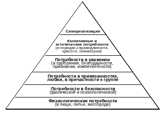 Теория Маслоу описывает мотивацию в терминах иерархии потребностей. Низшие (основные) потребности должны быть разумно удовлетворены, прежде чем потребности высшего порядка станут доминантой побудительных сил в поведении человека. Иерархия потребностей в порядке доминирования следующая: