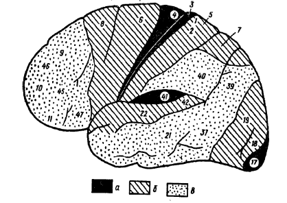 Рис. 1. Карта цитоархитектонических полей коры головного мозга. Конвекситальная поверхность коры больших полушарий: а — первичные поля; б — вторичные поля; в — третичные поля